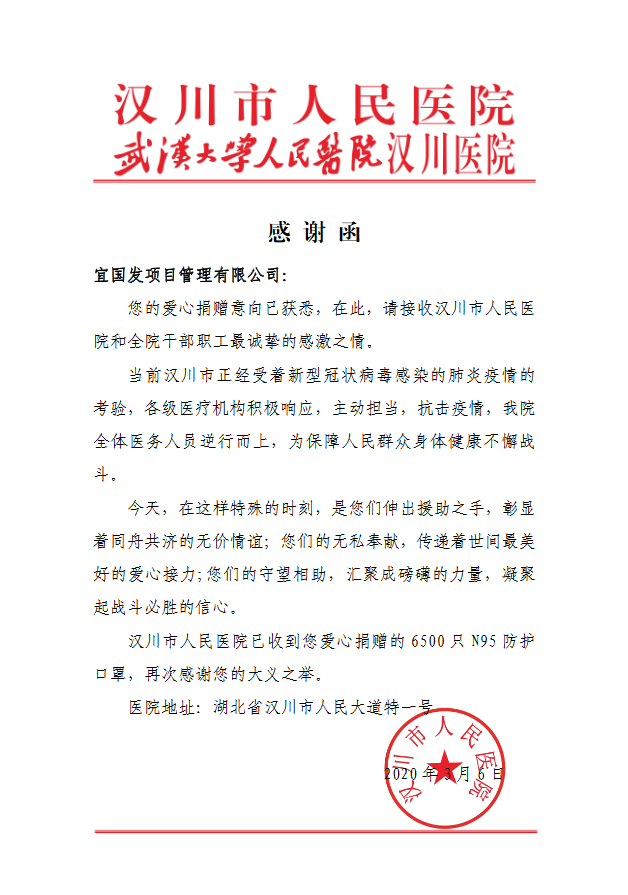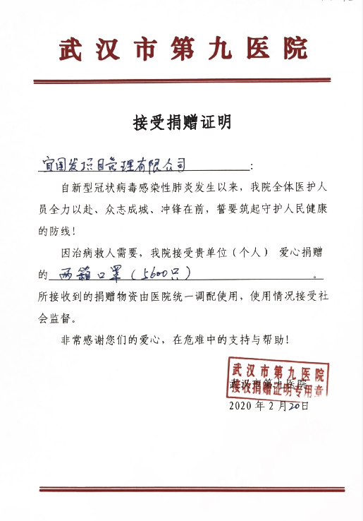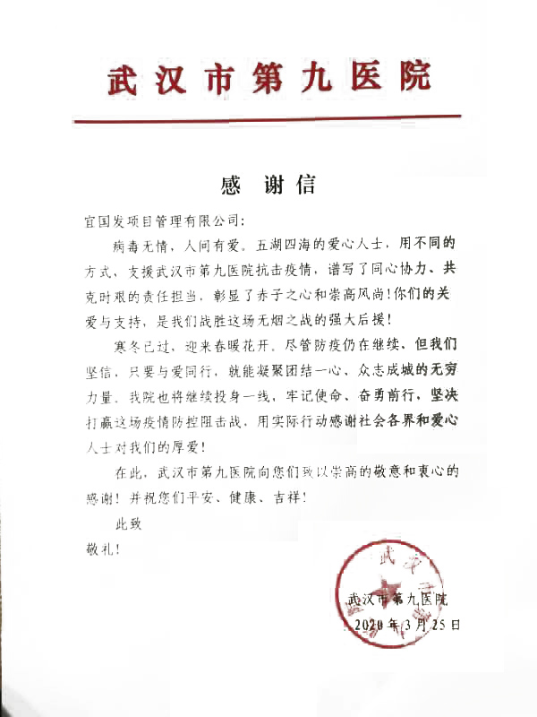 湖北疫情举国震动,医护人员舍小家顾大家、不眠不休奋战在防疫一线,用生命筑起屏障。宜国发项目管理公司得知疫区防护物质紧缺,万分焦急。发动国内外各种渠道,不惜成本及代价,采购到大批护目镜、N95口罩、一次性外科医用口罩等防护用具,并在第一时间将物资捐赠到疫区的各个医院,尽绵薄之力为一线的战士们增加一份安全保障,将无私的爱心进行传递。