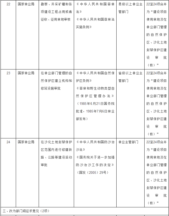 林业部门3项整合为1项:将“勘察、开采矿藏和各项建设工程占用或者征收、征用林地审核”、“在林业部门管理的自然保护区建立机构和修筑设施审批”、“在沙化土地封禁保护区范围内进行修建铁路、公路等建设活动审批”3项,合并为“建设项目使用林地及在林业部门管理的自然保护区、沙化土地封禁保护区建设审批(核)”1项。