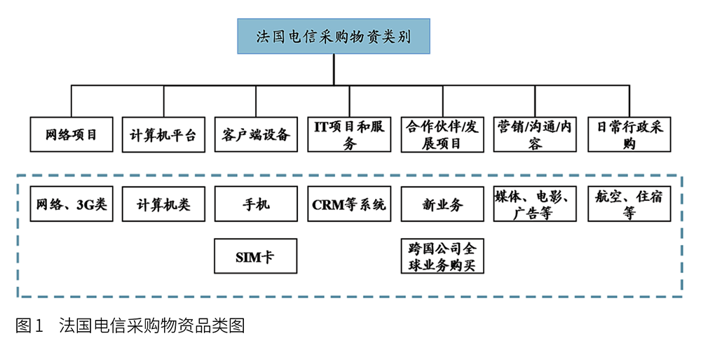 国际运营商通常以产品特性为出发点,根据供应商基础及产品流程维度等进行类的划分。如法国电信将采购物资划分为七大领域共80多类(见图1)。