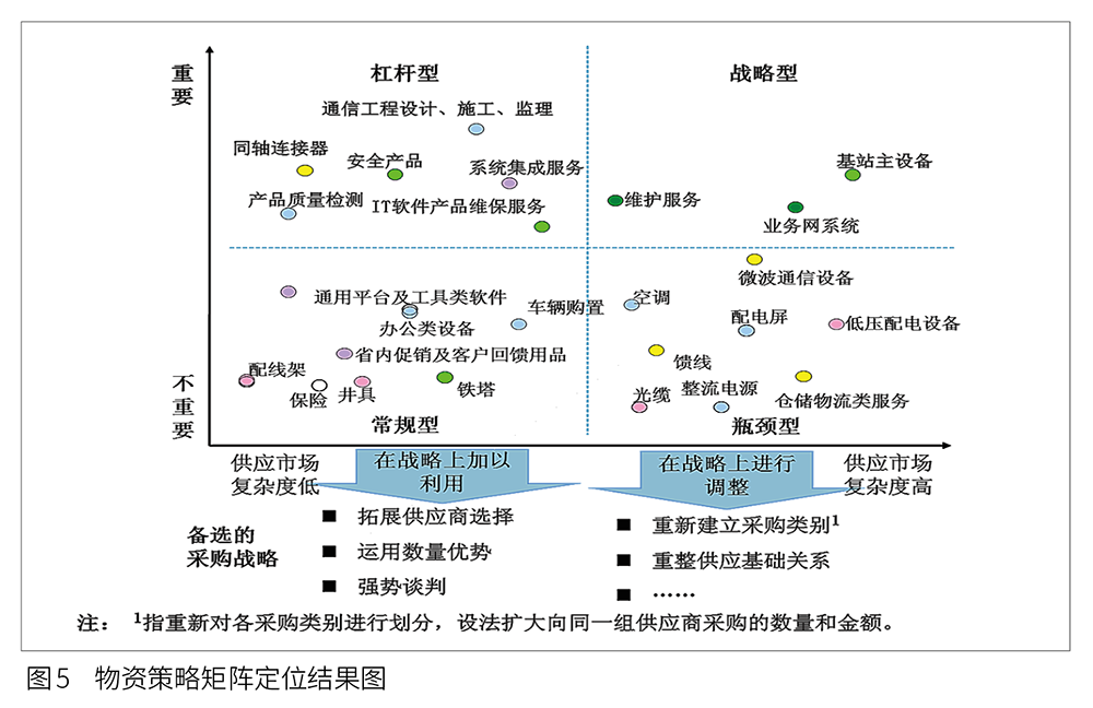 根据分析结果,对物资进行策略矩阵定位,如图5所示。其中,重新建立采购类别是指重新对各采购类别进行划分,设法扩大同一组供应商采购的数量和金额。根据策略矩阵对采购物品定位的结果,选择合适的采购策略方向。