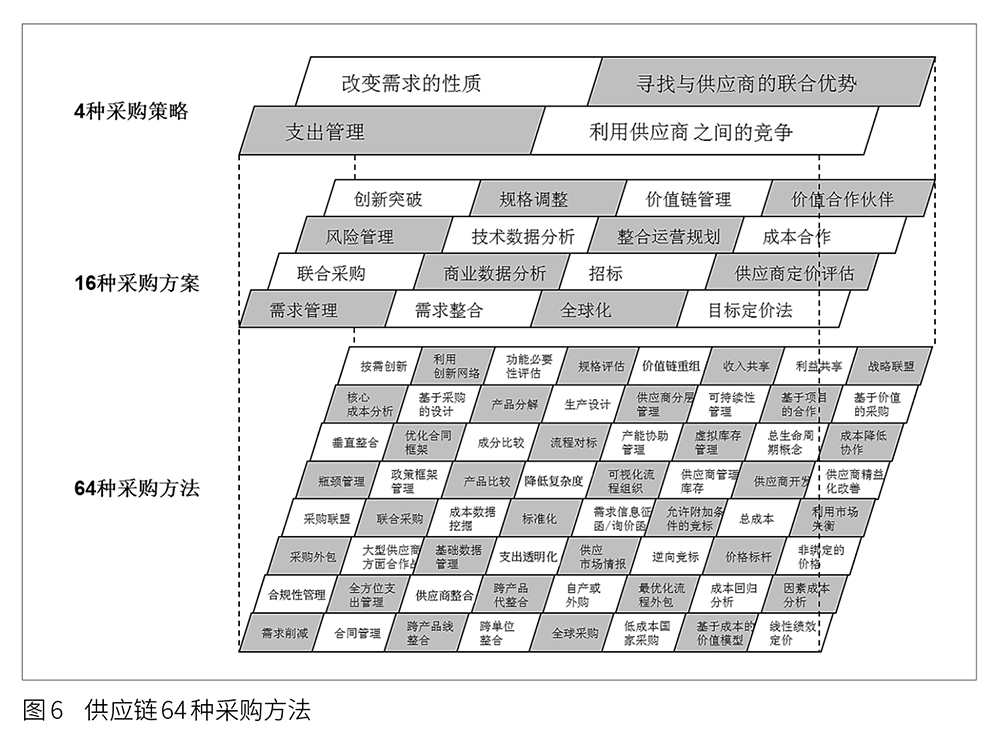 通过供方和需求方的力量对比,判断基本的采购策略,根据采购策略中的基本策略对应16种采购方案以及64种采购方法,如图6所示。