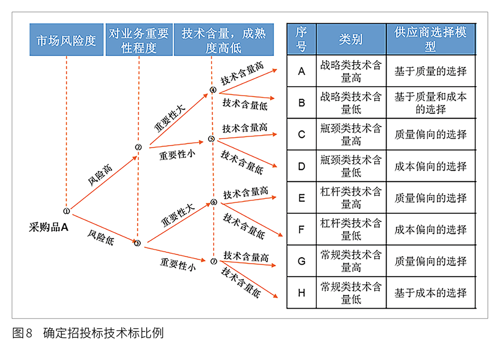 在确定了技术标占比和供应商选择模型后,依据表8所示的供应商选择评标标准对不同的采购物资进行分类,确定供应商选择方式。