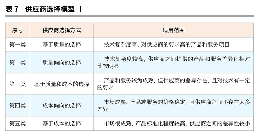 在此基础上建立五类供应商选择模型,不同物资的招标投标关注点不同,在实际操作时应选取对应的供应商选择方式,如表7所示。