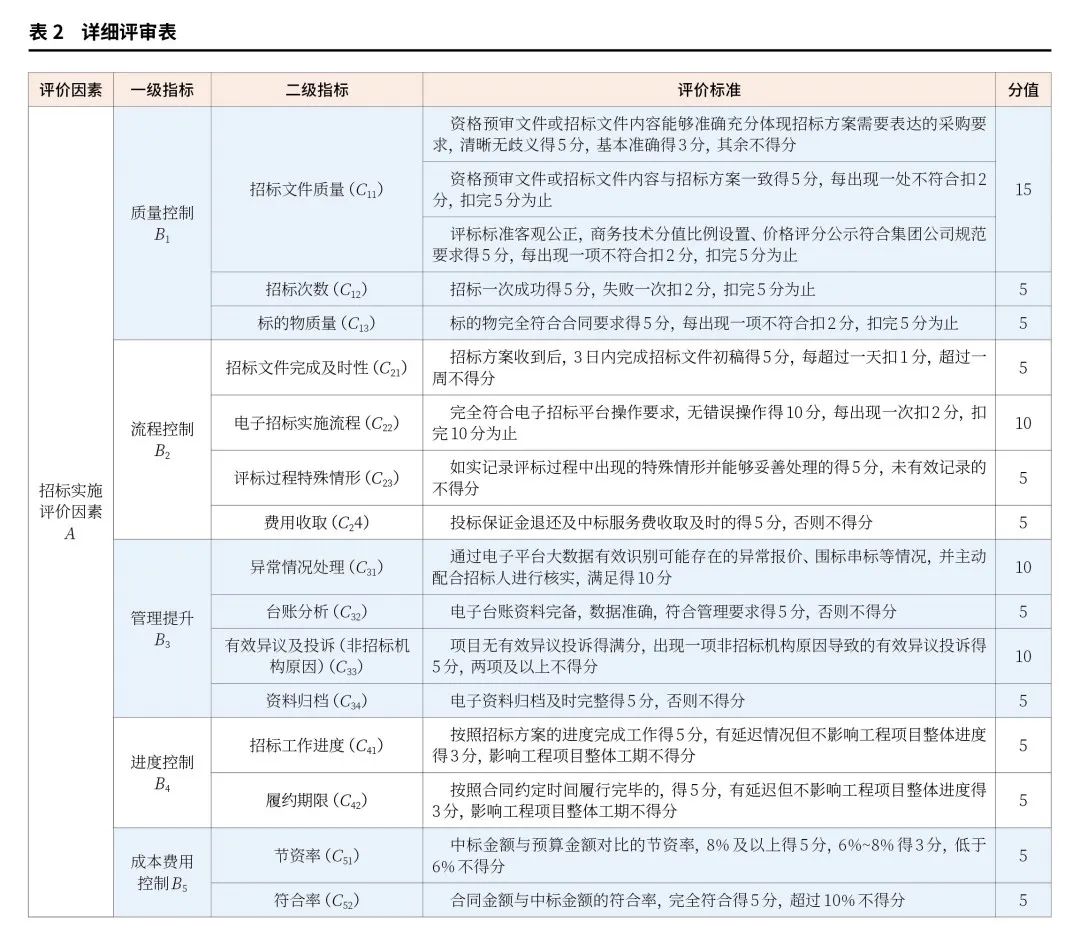 以提质增效总目标为导向,综合考虑强化合规管理、本单位招标业务部门考核指标等因素,共设计了5个一级指标,分别为质量控制、流程控制、管理提升、进度控制、成本费用控制五个方面。其中,质量控制分为招标文件质量、招标次数、标的物质量3个二级指标;流程控制分为招标文件完成及时性、电子招标实施流程、评标过程特殊情形、费用收取4个二级指标;管理提升分为异常情况识别、台账分析、有效异议及投诉(非招标机构原因)、资料归档4个二级指标;进度控制分为招标工作进度、履约期限2个二级指标;成本费用控制分为节资率、符合率2个二级指标。根据以上评价指标,详细评审细则见表2。