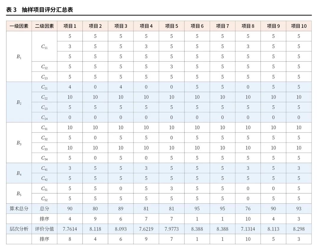 同理可以依次计算每个项目的评价得分,结果见表3中层次分析评价分值。